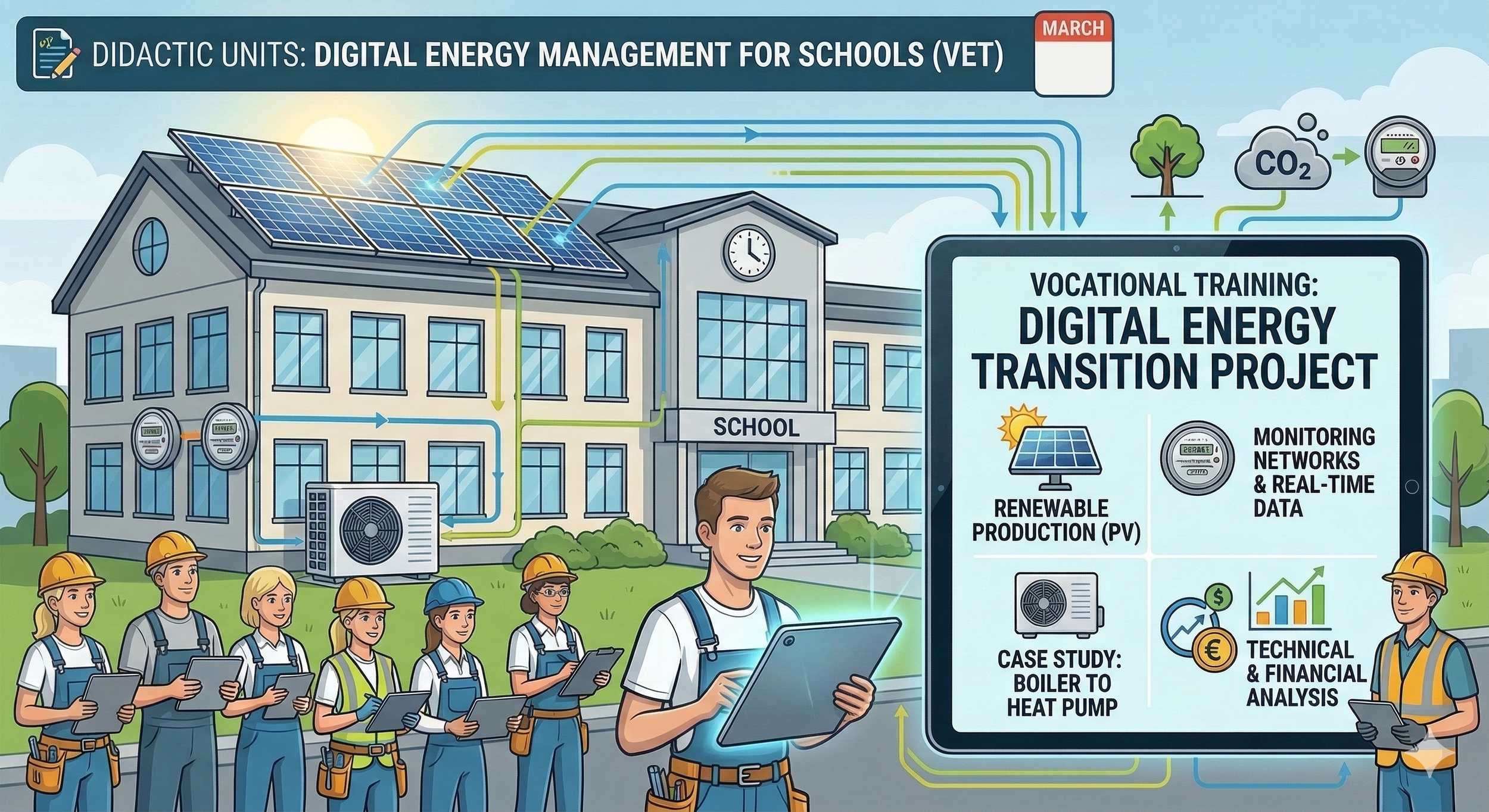 These educational units focus on the digitalization of energy management in school environments. They provide VET students with the technical knowledge to introduce renewable energy production, specifically through photovoltaic systems, and master various methods for real-time monitoring of consumption and output. This includes practical guidance on deploying professional monitoring networks and open-source platforms, culminating in a detailed case study on the technical and financial steps needed to replace a traditional gas boiler with a highly efficient heat pump system.